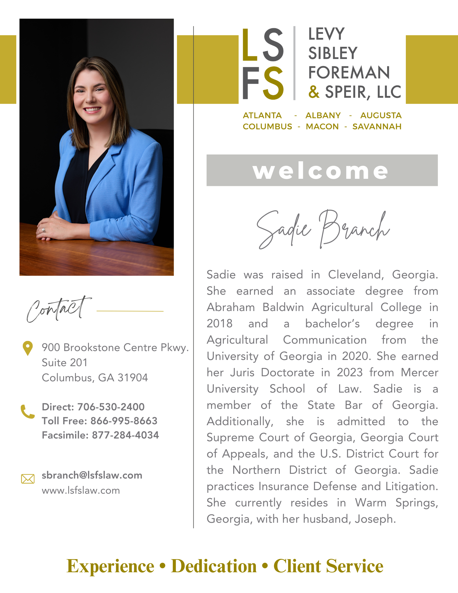 Sadie was raised in Cleveland, Georgia. She earned an associate degree from Abraham Baldwin Agricultural College in 2018 and a bachelor’s degree in Agricultural Communication from the University of Georgia in 2020. She earned her Juris Doctorate in 2023 from Mercer University School of Law. Sadie is a member of the State Bar of Georgia. Additionally, she is admitted to the Supreme Court of Georgia, Georgia Court of Appeals, and the U.S. District Court for the Northern District of Georgia. Sadie practices Insurance Defense and Litigation. She currently resides in Warm Springs, Georgia, with her husband, Joseph.